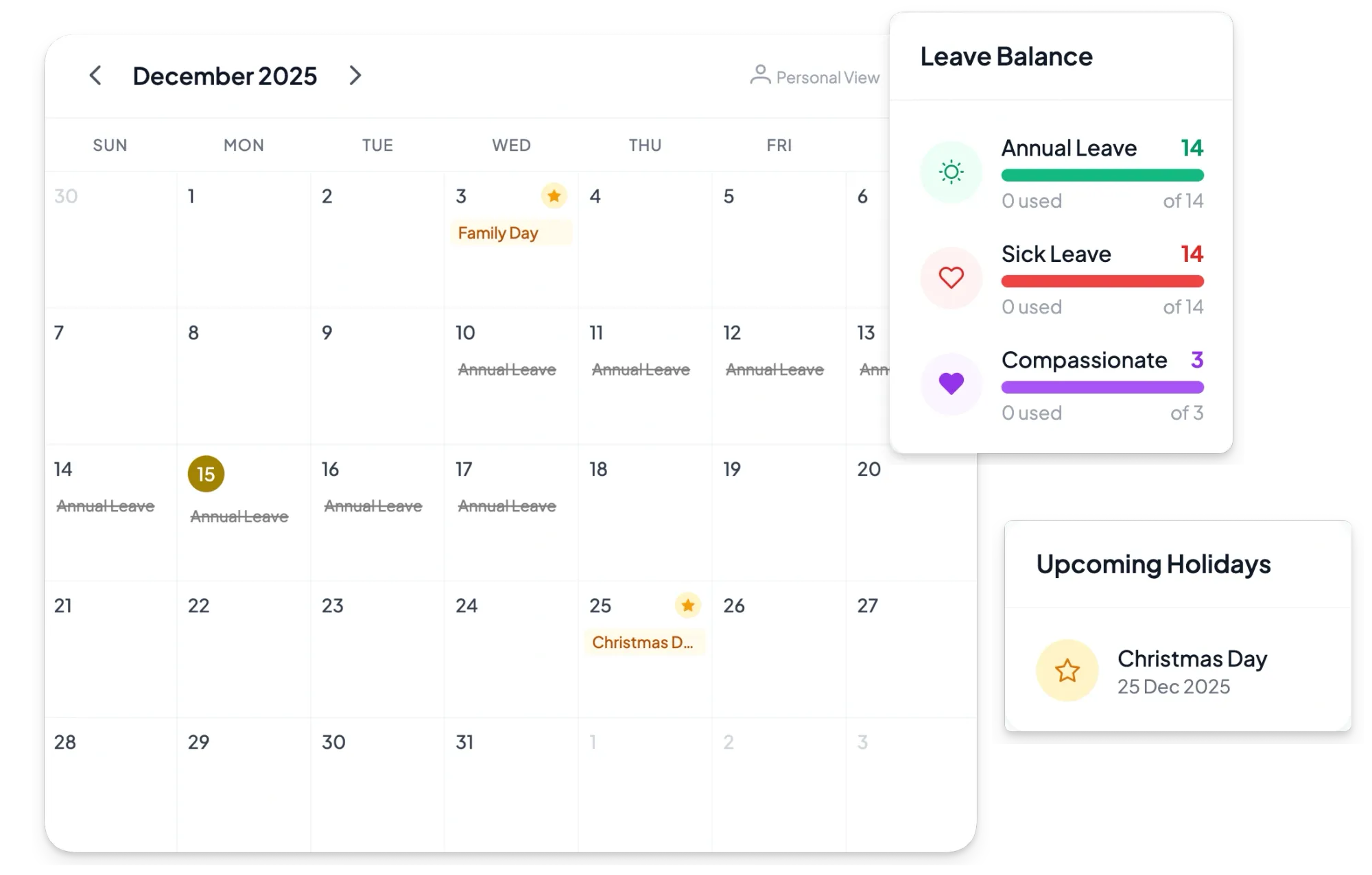 Instead of chasing updates across spreadsheets, chat threads, and inboxes, your team gets one shared calendar view for approved leave, public holidays, and availability. People can submit leave in seconds, managers can approve in one click, and balances/status stay updated automatically—so everyone knows who’s in, who’s out, and what needs coverage. We also support custom leave types and Google Calendar sync, so availability stays accurate where your team already plans meetings.